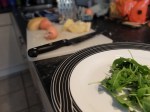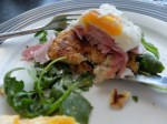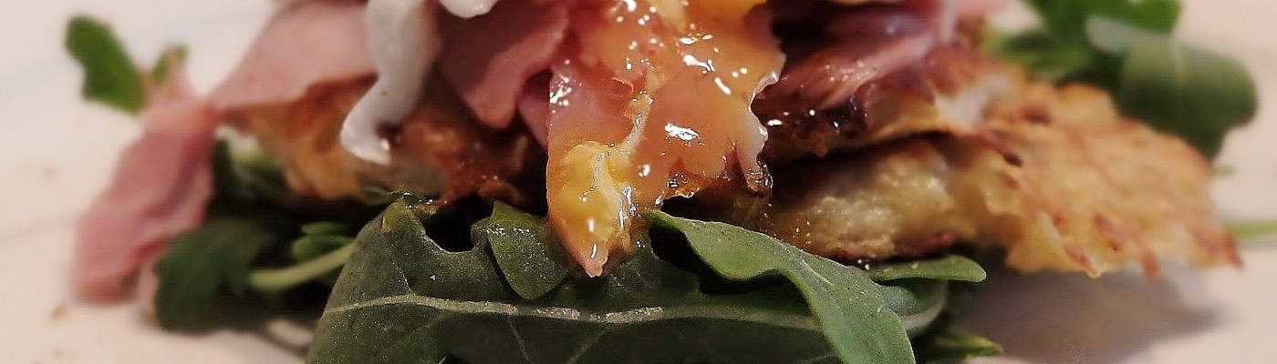 Tower the rocket, Rösti, ham (torn into pieces) and egg, garnish with black pepper.