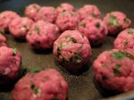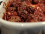 These meatballs were made with finely chopped parsley, 2 cloves of garlic and the mince in a bowl. Stir and fashion into small balls by rolling between your palms. Fry them (in Frylight) for a couple of minutes so the meatballs are brown all over, then add to a baking dish.