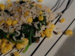 Bake at 190°C / fan 170°C for 25-30 minutes. Pop a long grain and wild microwave rice packet into the microwave for 2 minutes, followed by the spinach for 45 seconds. Add the spinach and sweetcorn to the rice and stir.