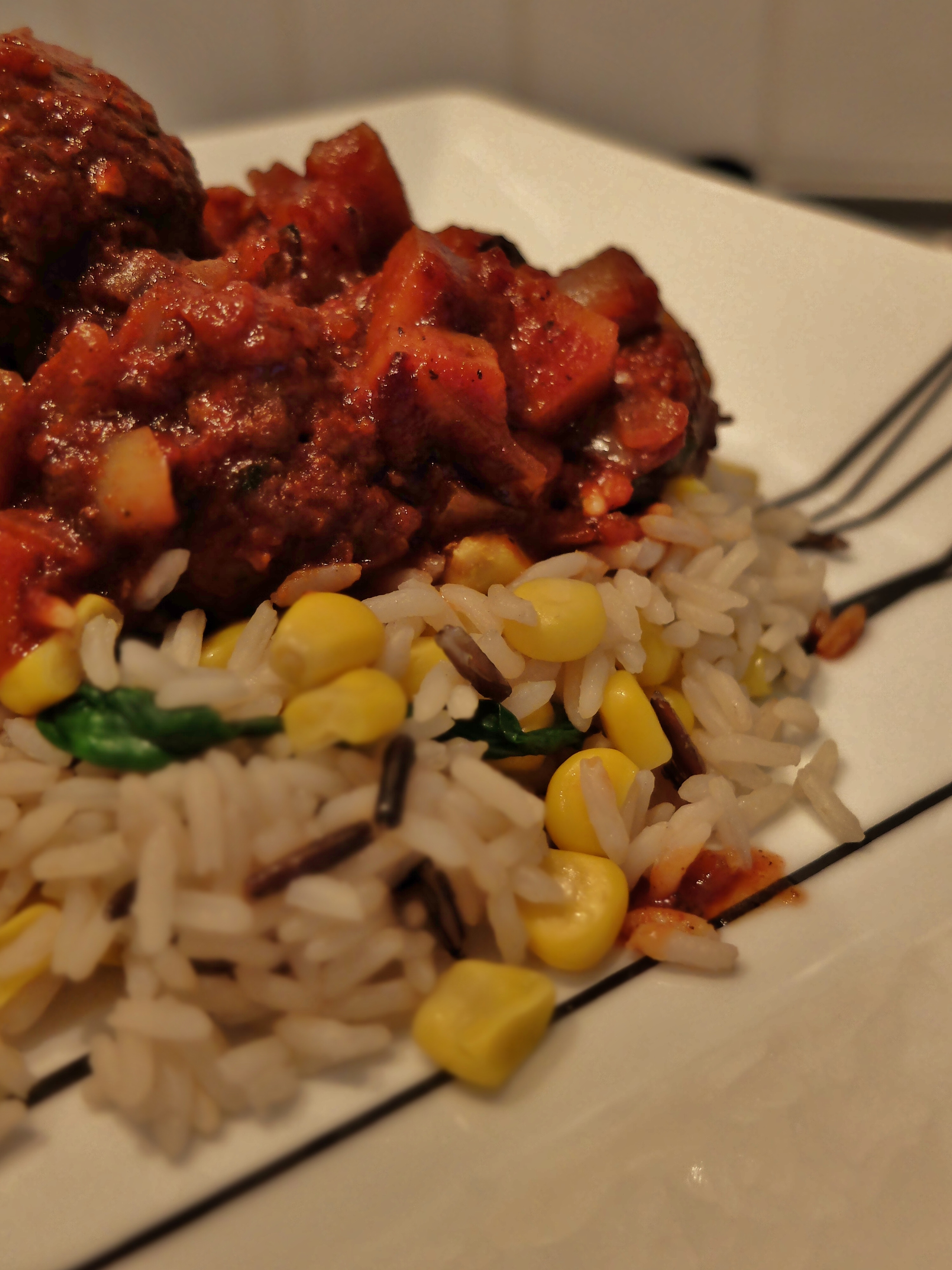 These are “Albondigas” – Spanish meatballs, with spinach and sweetcorn rice courtesy of Slimming World’s July 2014 issue!