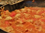 Chop the onion and fry in Frylight, the add the chicken and garam masala (I like to “coat” the chicken in it). Once sealed, add the chopped pepper, tomatoes and chicken stock. Pop the other peppers in the oven and leave the curry to simmer for 20 minutes.