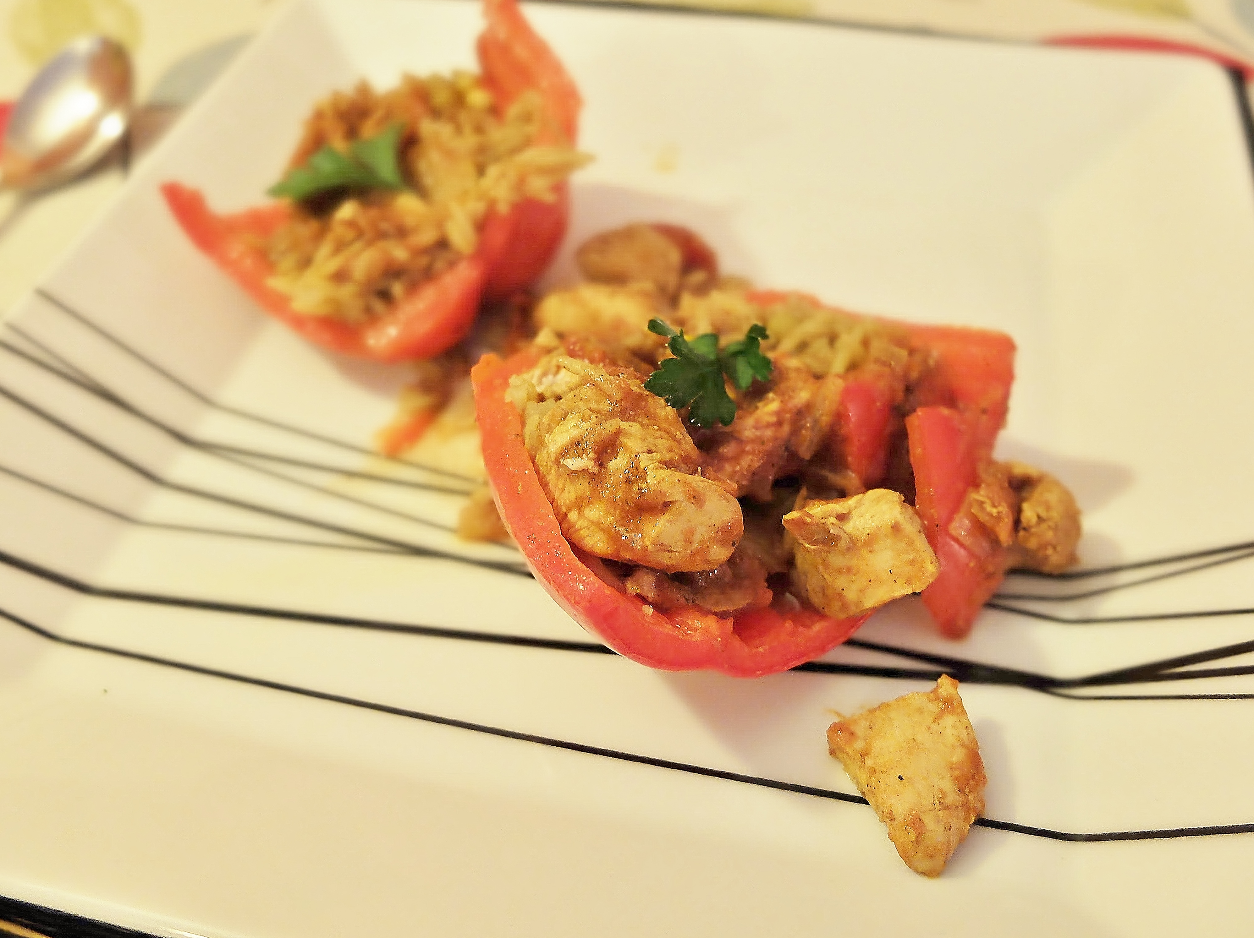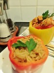 Just before the 20 mins are up, microwave the rice. Serve all in one pepper or a curry / rice split, and garnish with parsley.