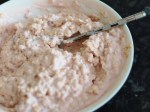 The night before, mix the oats and Muller light into a bowl and leave in the fridge overnight (creating Overnight Oats). In the morning, add two eggs to the mixture, add a little sweetener and whisk to make it as smooth as possible.
