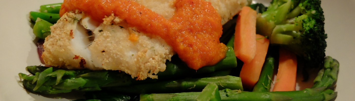 Baked cod in a herb crust, with a red pepper sauce